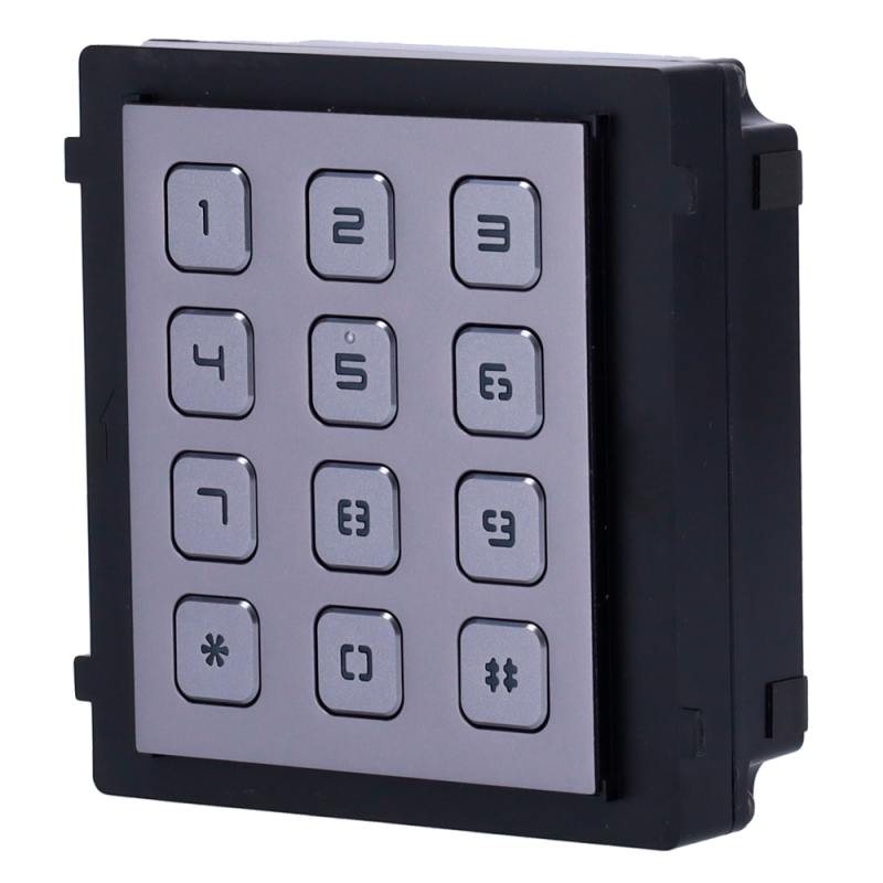 El DS-KD-KP se integra de forma nativa en sistemas de videoportero modular Hikvision serie DS-KD, permitiendo añadir control de acceso por código con un acabado más moderno que el teclado físico.